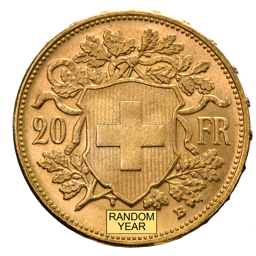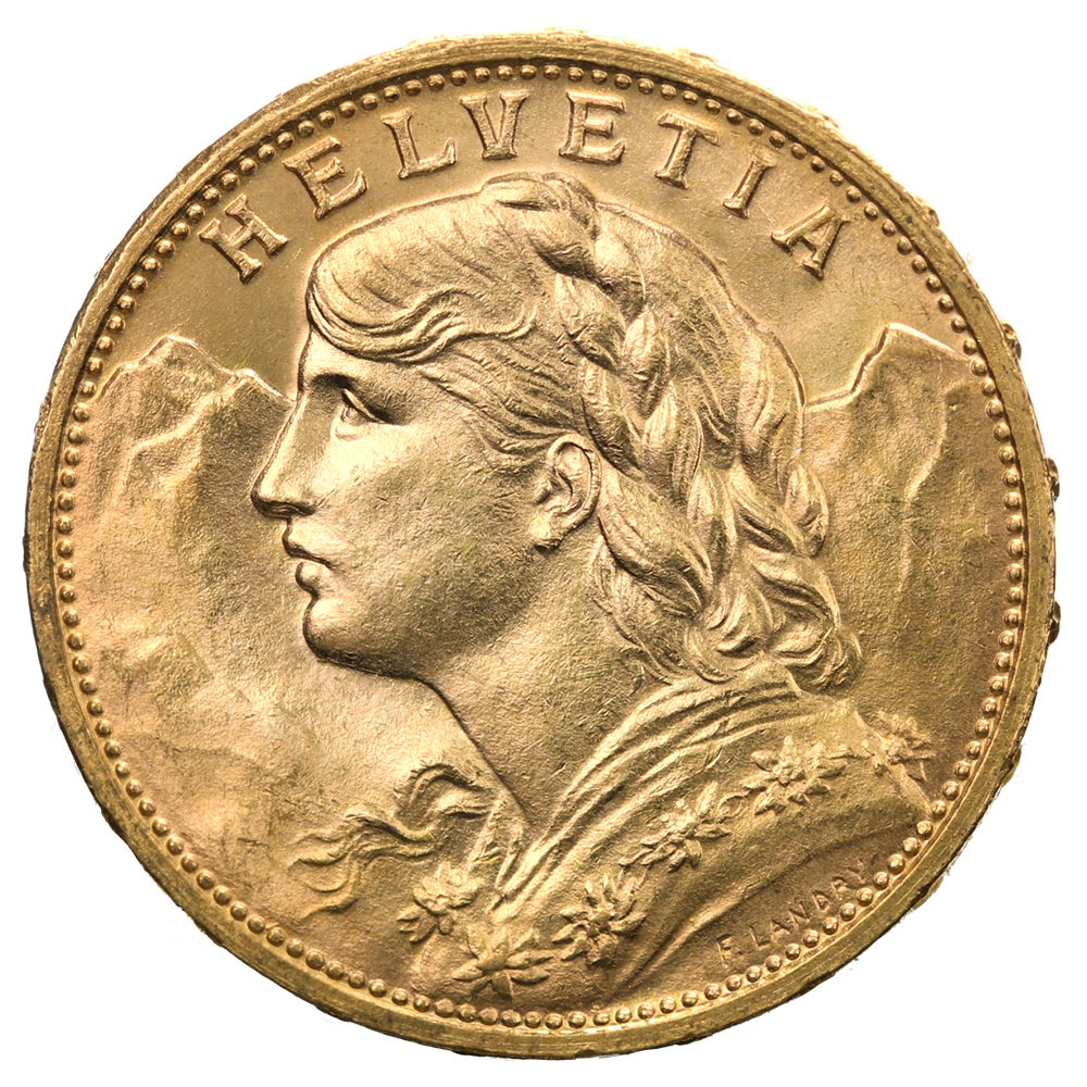 The Swiss 20 Franc Helvetia/Vreneli gold coin is a classic and highly recognized bullion coin minted by the Swiss government between 1897 and 1936. The coin is named after the figure of "Vreneli", a Swiss girl whose portrait appears on the obverse side of the coin.